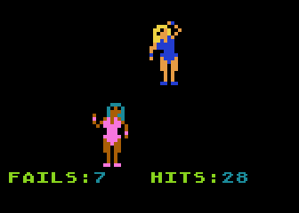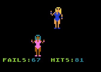 In the bottom of the screen was displayed the next cache buffer, and that gave me the idea of two ladies in the playfield at the same time: one for Simona and one for the player, but they shouldn't be the same image, at least the color of the clothes should be different, and I already was using all 3 colors and the background. I could had a 4th color if I had used ANTIC text mode 4, and used inverse video in the chars of one of the ladies, but the images would be much smaller. By those days, I was talking with DMSC about adding display list interrupts (DLI) to his FastBasic language. With a single DLI it would be possible to have 2 completely different color sets, one for each character. But the development of DLI in FastBasic took too much time trying to find the best way to add such powerful feature to the language that it could manage many interruptions in the same screen and be simple to use at the same time, and the developement of this game got frozen for many months... During this stand-by period, I thought about a variation of the game: instead of a Simon-like game, make a reflex game, trying to react as fast as possible. When the call for the 2020 contest arrived, I had to decide which of the variations to try first, and the reflex version won over the memory one.